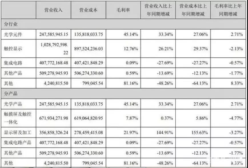 雖然觸控顯示類業(yè)務是聯(lián)創(chuàng)電子最大的主營業(yè)務,但今年上半年,該公司的光學產品成為光學產品、顯示屏及加工、集成電路產品、其他產品幾大主營分產品中毛利率唯一增加的一個主營產品。